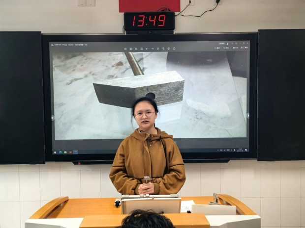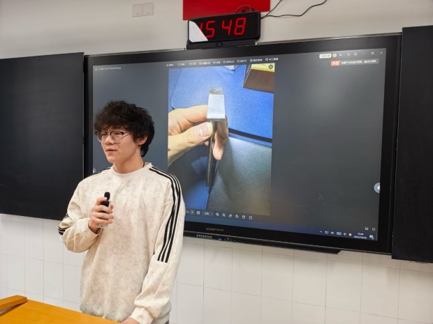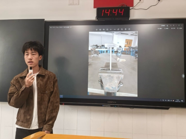 汇报开始前,不少同学拍照记录自己钳工的实训成果,更有同学将自己亲手打磨的工件带到讲台上,与大家热情分享创作心得,同学们积极主动的态度,为整个汇报会奠定了热烈而欢快的基调。结合着屏幕上工件照片的闪动,从每日通勤的辛苦与坚持,到食堂伙食的惊喜与美味;从实训过程中的专注与努力,到课余时间发生的各种趣事——每一位同学的发言都洋溢着满满的收获,既有对专业知识的认真探讨,也有对生活细节的幽默调侃。最终,经过班干部们的共同商议,评选出三位表现尤为突出的同学,并对他们进行了表彰与奖励。